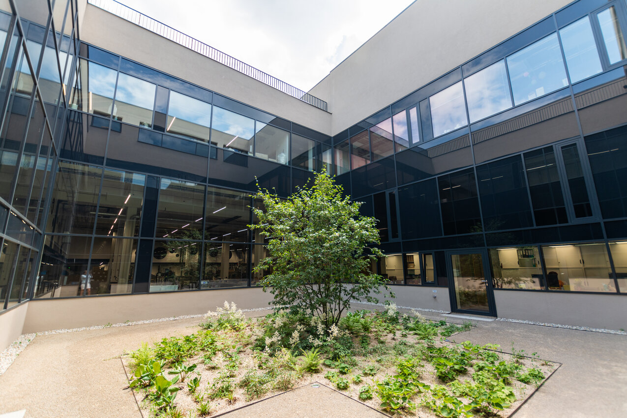 Ploché střechy jsme osázeli tak jako u předchozí budovy Mlaty – rozchodníky a sukulenty. Zelené střechy přirozeně zadržují vláhu a mají skvělé izolační schopnosti. Aby se během roku krásně zelenilo i okolí budovy, vysázeli jsme za ni a také kolem parkoviště alej 20-ti vzrostlých stromů. Jejich koruny poskytnou útočiště drobnému ptactvu a v letních dnech zajistí příjemný stín.