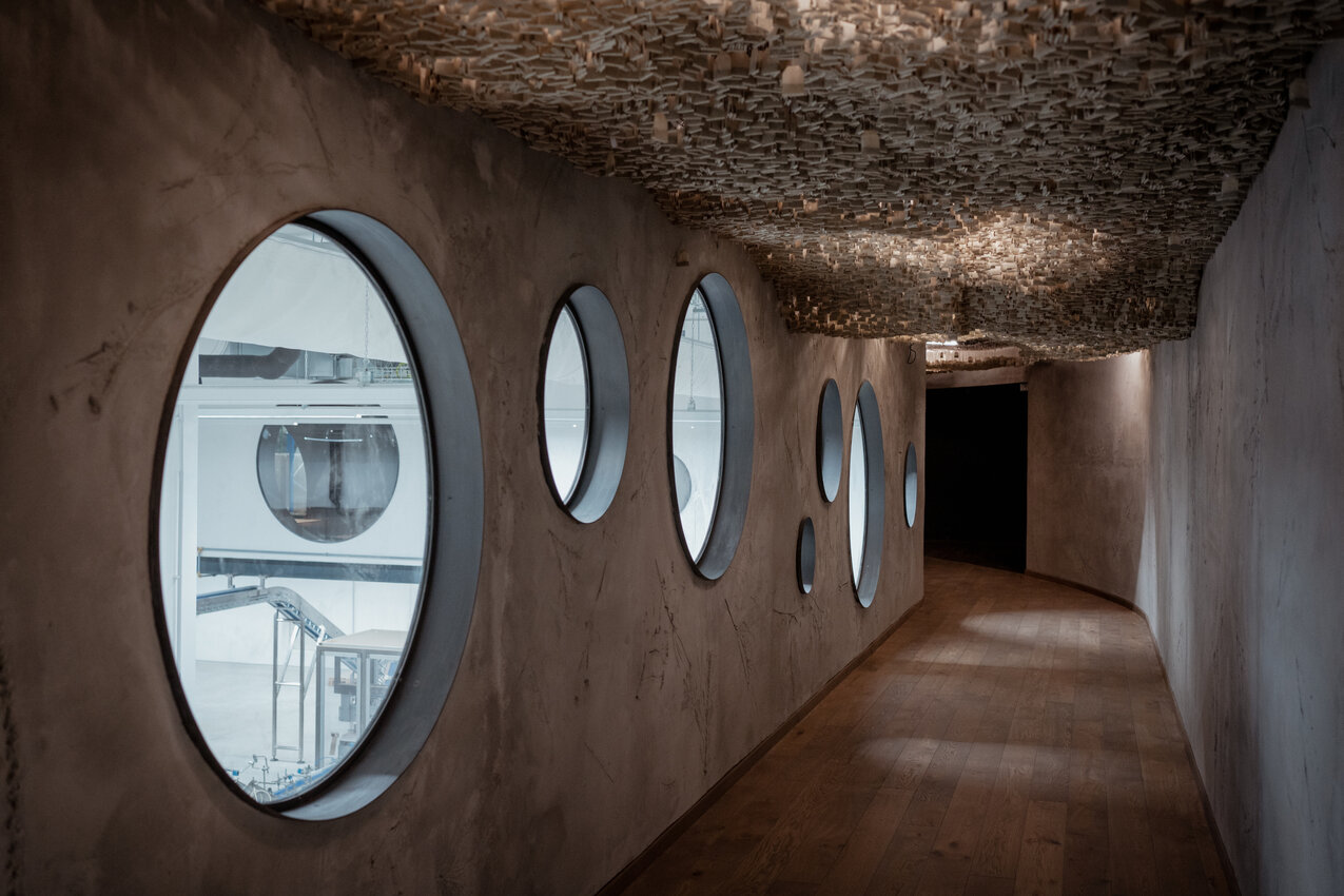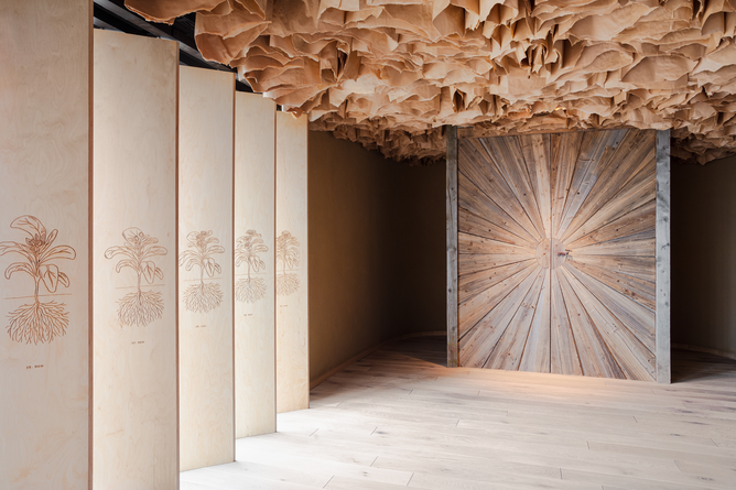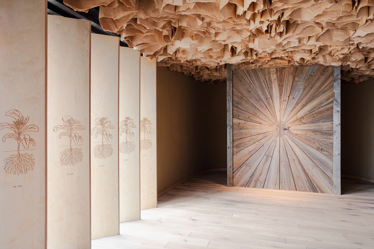 2. Stropy jsou tvořeny z trhaných papírových pytlů, ve kterých nám naši biopěstitelé dodávají nasušené bylinky a koření. Kompozice vytváří organické vlny, jenž evokují naše kořeny a organickou strukturu půdy.