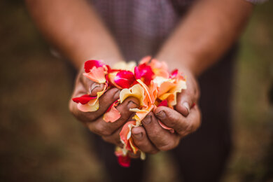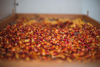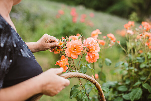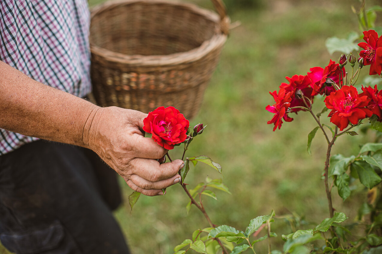 V půli května růže nakvétají nejvíc. To jsou pak keříky obsypané kolem dokola a po dobu dalších tří týdnů máme s rodinou o zábavu postaráno. Rád se zapojí i manžel Jan a dcera. Sbíráme obden. Květ obejmeme v dlani a zatrhneme okvětní plátky. Zbylý šípek je pak třeba utrhnout, aby růže netlačila do semene a měla tendenci růst dál. Sběr květů trvá až do srpna, pak nastává relativní klid, který obratem využijeme k pravidelné výzdobě místního kostela, aby si i jeho návštěvníci užili krásu pestrých barev a květů v podobě slunečnic a našich růží. Naše zahrada čítá přibližně 20 arů a nachází se kousek od tohoto kostela a v blízkosti jsou stromy a zeleň.
