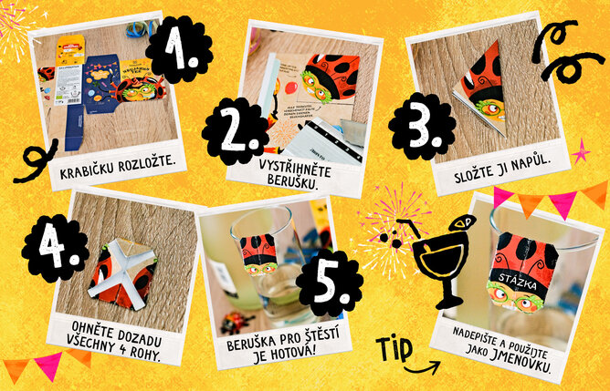 Z krabičky si pak můžete vystřihnout veselou jmenovku na skleničku. Na zdraví!