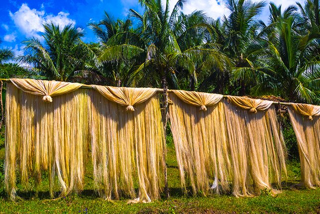 Kmen banánovníku dosahuje výšky až 6 metrů a sklizí se obvykle třikrát do roka. Rostlina může má zhruba 20 listů, z jejichž žilek se získávájí až dva metry dlouhá vlákna. Ty se zbaví pochev a následně se vysuší na slunci. Vlákno obsahuje až 77 procent celulózy. Je odolné proti účinkům mořské vody a je pevné zhruba jako polyester.