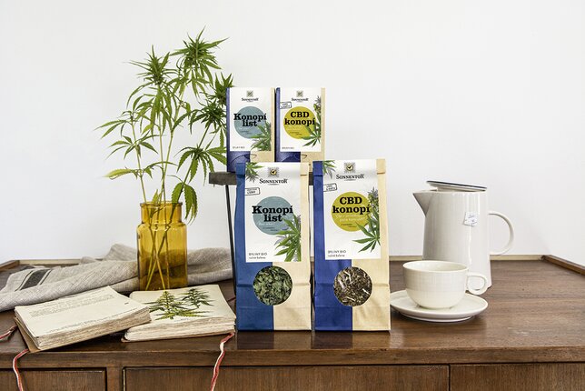 Konopný list v sortimentu SONNENTORU najdete například už ve směsi Hlavu vzhůru, poprvé se však objevuje i v regálu jednodruhových čajů. Sypaný konopný čaj je ručně balen přímo na rodinné farmě Bauerů v Rakousku, na pultech SONNENTOR prodejen a zdravých výživ ho ale najdete i v porcované podobě, přičemž každý jeden sáček vzniká u nás, v jihomoravských Čejkovicích.