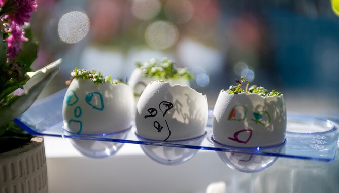 Skořápky na vrchní straně lehce poodlamujte, aby vám vznikly "mističky". Jednotlivým skořápkám nakreslete veselé tvářičky. Poté je naplňte trochou hlíny či vaty a posypte semínky řeřichy. Zalijte malým množstvím vody. Do týdne máte vlasáčky v plné kráse! Usadit je můžete do stojánků na vajíčka nebo je uložit na talířek se slámou, mechem či osením.