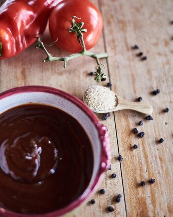 Rajský protlak, jablečné pyré, med a jablečný ocet přiveďte ve vyšším hrnci k varu. Vmíchejte koření, whiskey a borůvky. Vařte zhruba hodinu. Pravidelně promíchávejte, aby se omáčka nepřipálila. Pokud chcete mít omáčku dokonale hladkou, propasírujte ji.
