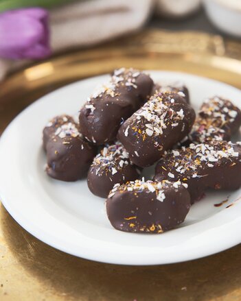 Rozehřejte hořkou čokoládu s kokosovým olejem a obalte každou tyčinku zvlášť. Nejlépe to půjde na mřížce, kde může čokoláda odkapávat.