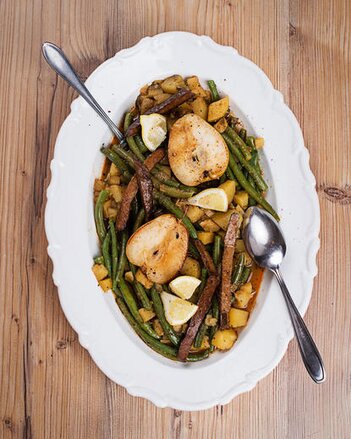 Seitan s oloupanou a nakrájenou hruškou osmažte dozlatova na oleji a podávejte s fazolovo-bramborovým gulášem. Ozdobte tenkými proužky nakrájené zelené části pórku.