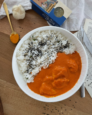 Do pánve přidejte další dvě lžíce másla a orestujte cibuli a česnek. Přidejte lžičku kurkumy, půl lžičky kmínu a lžíci koření Garam masala, vše důkladně promíchejte. Přidejte plechovku rajčat a nechte probublávat.