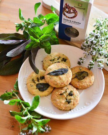 Na těsto položte čerstvé bylinky – např. šalvěj, tymián, list oregana. Přes pečící papír poté válečkem bylinky jemně vlisujte do těsta. Vykrajovátkem pak vykrojte kulatý tvar spolu s bylinkou uprostřed.