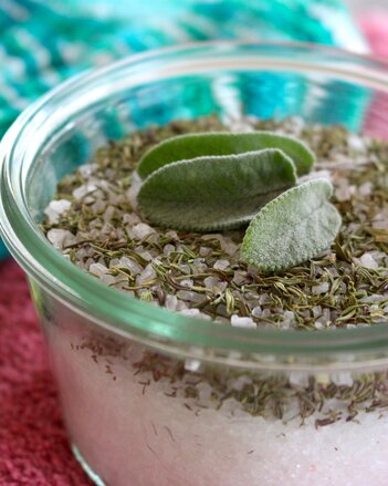 Do sklenice postupně vrstvěte sůl a bylinky. Závěrečnou vrstvu soli pokapejte 3–5 kapkami eukalyptového éterického oleje. Sklenici uzavřete a nechte ji několik týdnů odpočívat, aby sůl mohla absorbovat vůně.