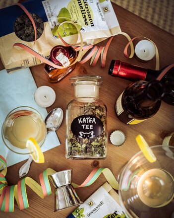 Příprava čaje proti kocovině: jednu vrchovatou čajovou lžičku směsi lehce promněte mezi prsty – chuť tak bude intenzivnější. Zalijte vroucí vodou a nechte 10 minut luhovat pod pokličkou.