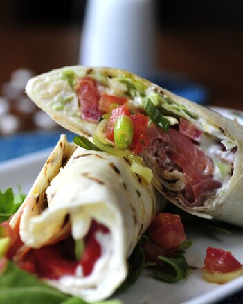 Zamíchejte sýr s lžičkou provensálského koření, středomořskou solí a potřete tortillu. Tortillu naplňte salátem, tofu, rajčaty a mandarinkou.