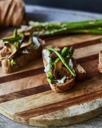 Opečte plátky ciabatty, natřete krémovým kozím sýrem a posypte kořením. Nahoru položte opečený chřest se žampiony a podávejte.