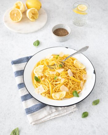 Špagety servírujte v hlubokých talířích ozdobozené citronovým pepřem, plátky citronu, čerstvou bazalkou a parmazánem. Můžete pokapat také olivovým olejem a podávat s olivami.