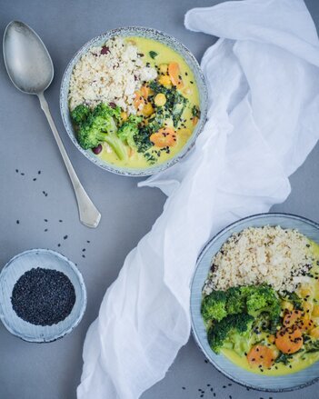 Podlijte vývarem a kokosovým mlékem, nechte 15 minut vařit.