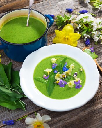 Jako základ polévky vám dobře poslouží jemná zeleninová kaše (s jíškou nebo bez ní) a bramborová polévka. Důležité je dát bylinky až ke konci vaření a pak rovnou servírovat. Polévku můžete zjemnit troškou smetany nebo šlehačky, v případě veganské verze pak smetany z kešu oříšků.