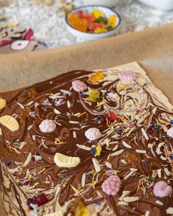 Na závěr čokoládu jemně zamíchejte metličkou a posypte podle chuti bonbonky, kořením a solí. Nechte přes noc vychladnout.
