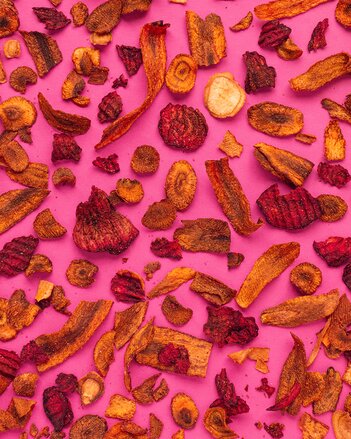 Červenou řepu nakrájejte na kolečka široké asi 1–1,5 milimetru, nejlépe vám to půjde na speciálním struhadle – mandolíně, nebo pomocí škrabky či nožíku, pokud máte pevnou ruku. Ostatní zeleninu nakrájejte na 2 mm silná kolečka, aby byla upečená stejně dobře jako řepa. Kolečka poklaďte na pečící papír tak, aby se nedotýkala navzájem. Posypte je zlehka kořením Sbohem, soli! a Holy Veggie a potřete olivovým olejem.