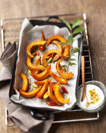 Dýni Hokkaido lze použít i se slupkou. Dýni dobře omyjte, rozpůlte a nakrájejte na asi 1 cm silné plátky. Potřete slunečnicovým olejem a dochuťte Kořeněnou solí na hranolky!
