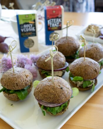 Na jednu půlku položte cibuli, polníček a naležené tofu. Přiklopte druhou půlkou a propíchněte párátkem nebo špejlí, aby burger držel tvar.