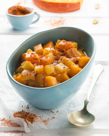 Cibuli osmažte na oleji, přidejte dýni, brambory, 3 lžíce Lajošova koření, případně i rajčatový protlak, podlejte vodou a vařte doměkka.