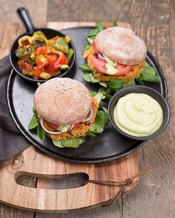 Burgery vložte spolu se salátem, kolečky cibule a plátky rajčat do celozrnných bulek, doplňte avokádovým dipem a podávejte s grilovanou zeleninou.