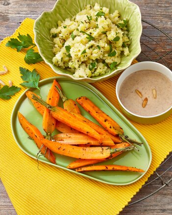 Karotky omyjte a překrojte napříč. Kmín a koriandr (1/4 lžičky) orestujte na rozpálené pánvi a pak rozdrťte v hmoždíři. Karotky uložte do zapékací mísy, osolte, opepřete, přidejte 0,5 lžičky Selského koření, pokapejte dvěmi lžícemi oleje. Pečte cca 20 minut a případně pootáčejte./