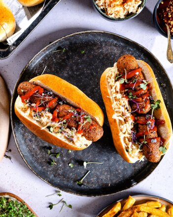 Hotdog s cizrnovými tyčinkami, ostrou omáčkou a coleslawem