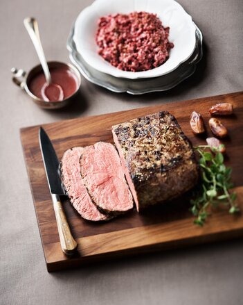 Koření na pečeni tetičky Aničky (3 lžičky) dobře vetřete do masa, osolte, opepřete a potřete dijonskou hořčicí a máslem. Uložte na pekáč, posypte nakrájenými datlemi a švestkami, podlejte vodou a vínem. 2. Pečte zakryté pokličkou při 100 ° C přibližně 1 ½ hodiny. Krátce před koncem pečení odstraňte pokličku a dopečte do zlatova.