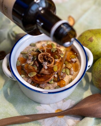 Do mísy dejte fermentovanou kaši ochucenou zázvorovým sirupem a opraženými hruškami.
