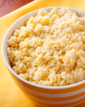 Přiveďte jáhly k varu s mlékem, vodou a kořením (sladká varianta) nebo s vodou a polévkovým práškem (slaná varianta), snižte teplotu a vařte při střední teplotě, dokud se tekutina nevyvaří. Čas od času promíchejte.