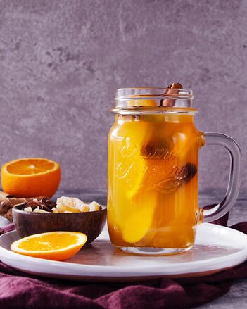 Vlijte do sklenic a zdobte plátkem pomeranče, kandovaným zázvorem, badyánem a skořicí.