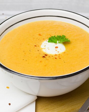 Polévku rozmixujte na krém, dochuťte solí a případně špetkou chilli. Pokud je příliš hustá, přilijte ještě trochu vývaru nebo vody. Servírujte posypané nasekaným koriandrem nebo petrželkou či nasucho opraženými semínky.