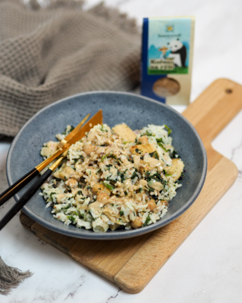 Nakonec smíchejte rýži, smetanový špenát s cizrnou a veggie kousky dohromady, přidejte 1 lžičku Koření na rýži mistra Wonga a důkladně promíchejte.