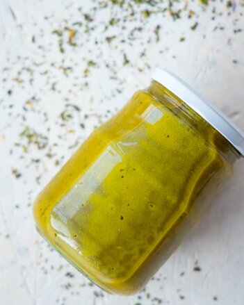 Nalijte všechny ingredience do velké šroubovací sklenice a dobře protřepejte, aby měla zálivka jednotnou konzistenci. Skladujte v ledničce.