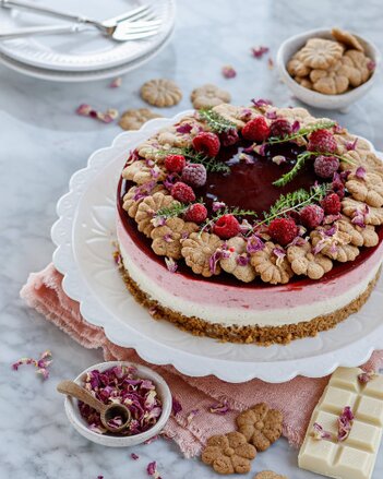 Před podáváním opatrně odstraňte dortovou formu. Okraje krému podle potřeby uhlaďte. Dort ozdobte několika sušenkami, čerstvými malinami a okvětními plátky růží nebo třeba Kouzelnými květy.