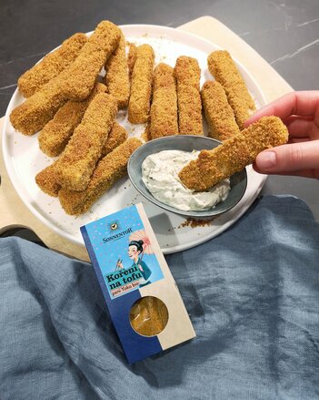 Tofu špalíčky obalujte ve škrobu, poté v mléce s octem, poté ještě jednou ve škrobu a mléce. Na závěr obalte ve směsi strouhanky. Špalíčky dejte na plech vyložený pečicím papírem a pečte zhruba 20 minut. Poté špalíky otočte a pečte další čtvrt hodinky.