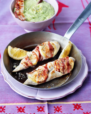 Kuřecí prsa opláchněte a podélně rozpulte. Poté ještě jednou - dohromady před vámi bude ležet 8 kousků. Každý z nich lehce osolte, obložte plátky citronu a omotejte slaninou. Takto připravené kousky opékejte na rozpálené pánvi zhruba 8 minut. Poté je dejte na teplý talíř a přikryté nechte “dojít”.