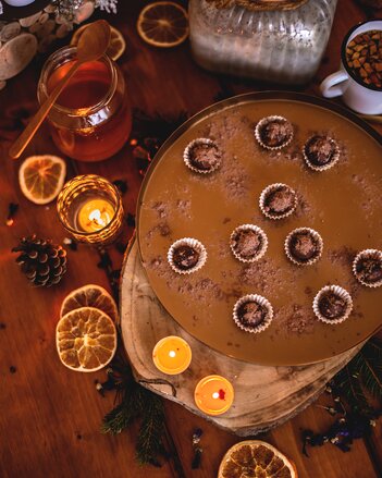 Z oříškové hmoty vytvarujte kuličky a umístěte na cca půl hodiny do ledničky. Poté ve vodní lázni rozpusťte čokoládu a kuličky v obalte v čokoládě a kurkumě.