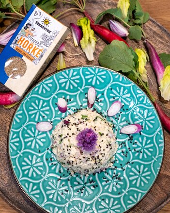 1. Květák nastrouháme, přidáme rozmačkaný česnek, najemno nakrájenou cibuli, ředkvičky, bylinky, Přirozeně hořké koření a Koření na letní zeleninu.