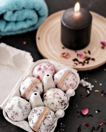 Auf dem Foto sind Blütenbadebomben in einem Eierkarton zu sehen. Dahinter ist eine brennende Kerze zu sehen. | © SONNENTOR