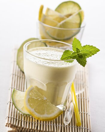 Citronový sorbet rozmixujte spolu s jogurtem, citronovou šťávou, 150 ml verbenového čaje (studený) a agávovým sirupem. Doplňte minerálkou dle chuti.