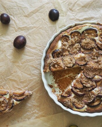 Formu vymažte máslem a dejte do ní vykynuté těsto. Možná se budete trochu lepit, proto pracujte rychle a dostaňte ho do všech stran. Následně na něj dejte náplň z tvarohu a poskládejte švestky. Nešetřete jimi a dávejte jednu vedle druhé, ať jich je tam opravdu hodně, koláč bude hezky šťavnatý. Zasypte drobenkou a dejte péct na 30-40 minut. Upečený koláč poznáte podle zlatavé krusty.