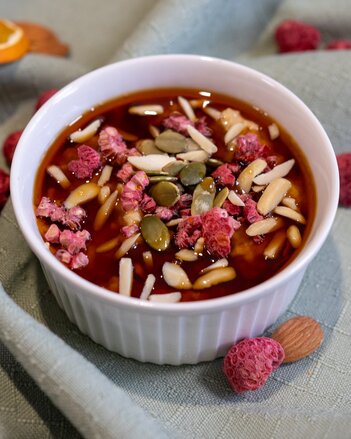 Vločky smícháme s Kola sirupem a lyofilizovanými malinami.