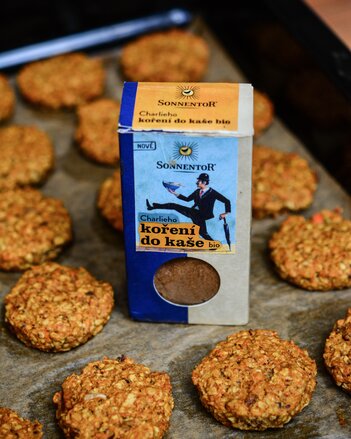 V malé misce smíchejte lněné semínko s teplou vodou a nechejte 5 minut odstát. Ve velké míse smíchejte mouku, ovesné vločky, prášek do pečiva, jedlou sodu, lžičku Charlieho koření do kaše a sůl.