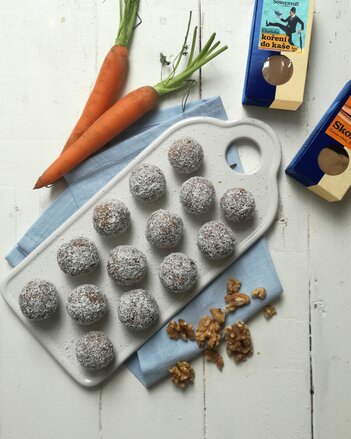 Mrkev nastrouhejte a spolu s nakrájenými datlemi a fíky dejte do mixéru. Přidejte kokosový olej, lehce promixujte, poté přidejte mleté ořechy, kokos a koření.