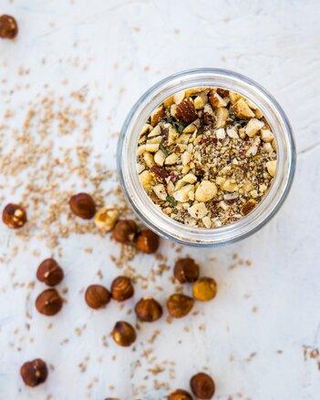 Přimíchejte druhou polovinu nasekaných lískových oříšků a rozdrcené lístky máty a uložte ve vzduchotěsné sklenici do lednice.