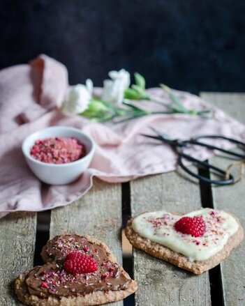 Na plech vyložený pečicím papírem tvarujte ze směsi srdíčka. Pečte je zhruba 20 minut, poté nechte zchládnout. Na závěr ozdobte hustým jogurtem nebo čokoládou, čerstvými malinami a kořením Všechno nejmilejší. Podávejte ještě teplé.