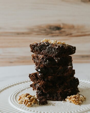 Vše opatrně promíchejte a nalijte do pečicím papírem vyložné formy (24x24 cm) a zasypte nasekanými ořechy. Pečte při 180 stupních zhruba 20 minut.
