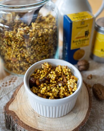 Sceďte pohanku a propláchněte ji čistou vodou, přidejte jáhlové pukance, slunečnicová semínka, kokos, rozinky, nasekané ořechy, makový olej, med (nebo agáve sirup) 2 lžíce koření Kurkuma latte a sušte v troubě při 100 °C do křupava.