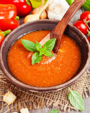 Všechny nakrájené přísady dejte do hrnce nebo hlubší mísy a rozmixujte dohladka. Dochuťte solí, pepřem, octem, olivovým olejem a kořením (1 lžička Sbohem, soli). Ještě jednou dobře promixujte.